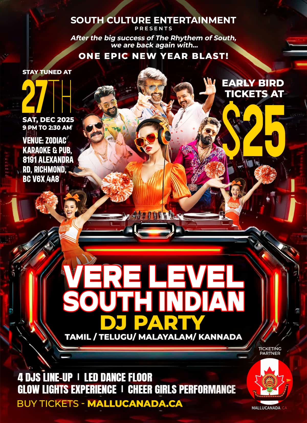 After the big success of Rhythem of South, we are back again with… A Grand South Indian DJ Night featuring an LED dance floor, glow lights, and nonstop south beats!